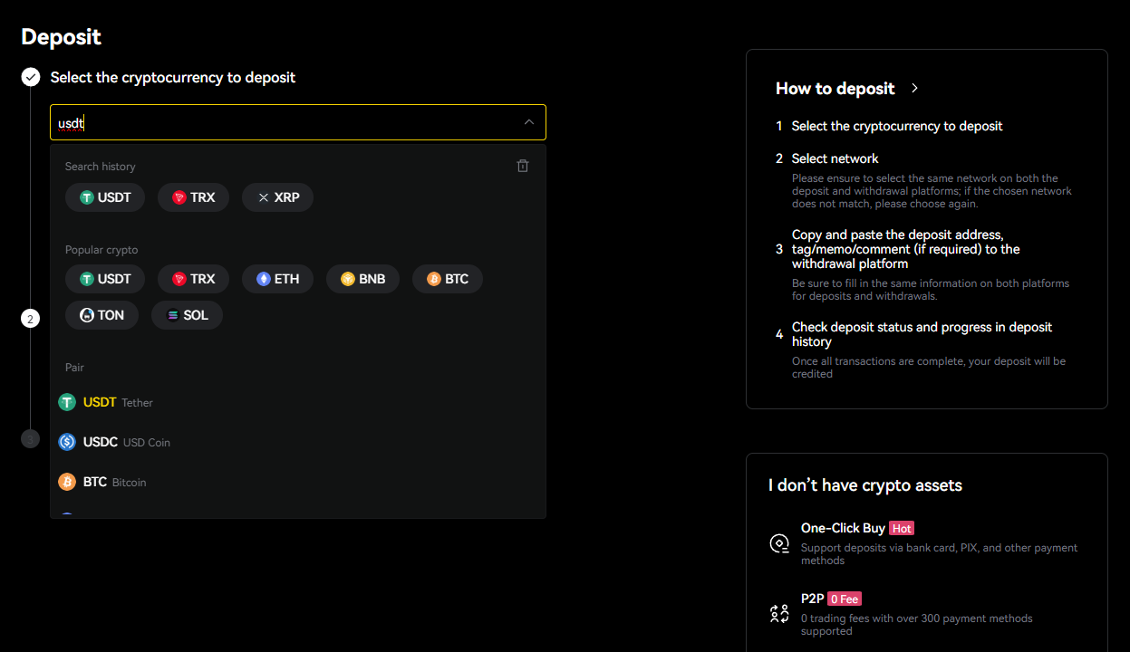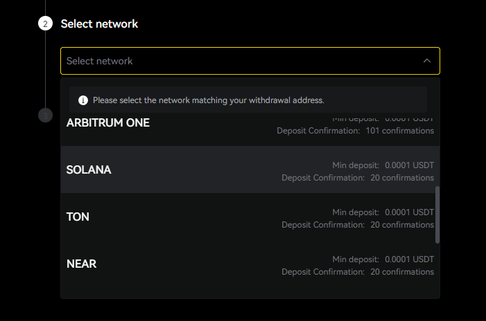 USDT를 선택하면 여러 네트워크 옵션이 나타납니다