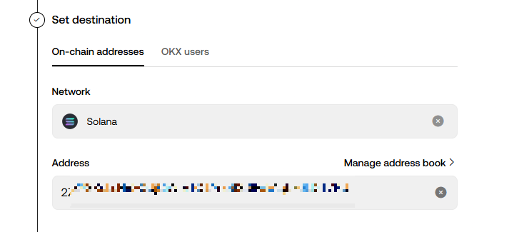 솔라나 네트워크를 선택하면 입금 주소가 자동으로 생성됩니다
